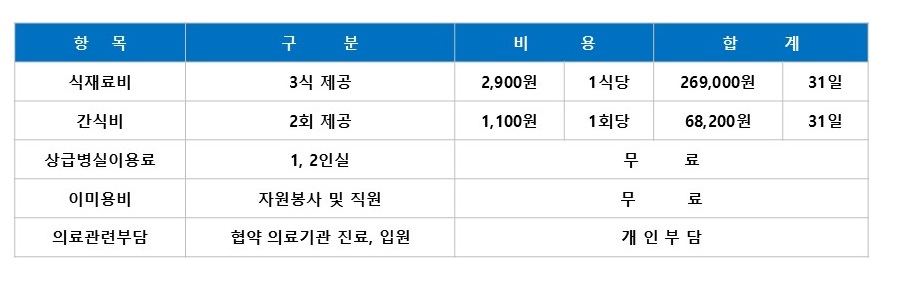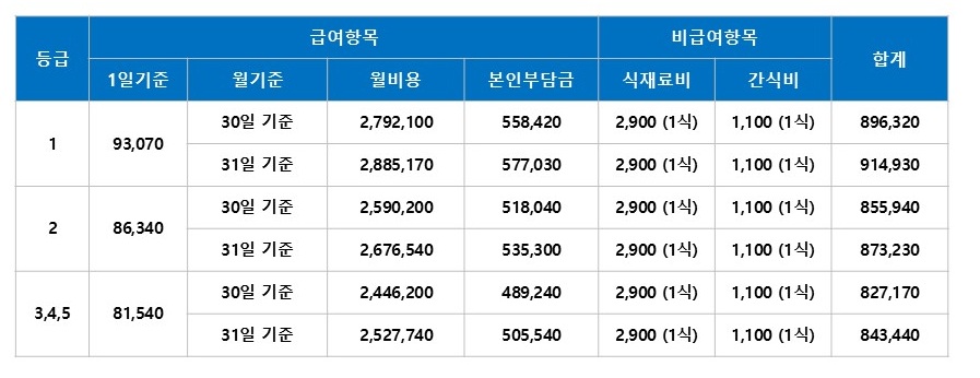 등급별 입소 비용안내 (기초생활보장 수급자는 전액무료)